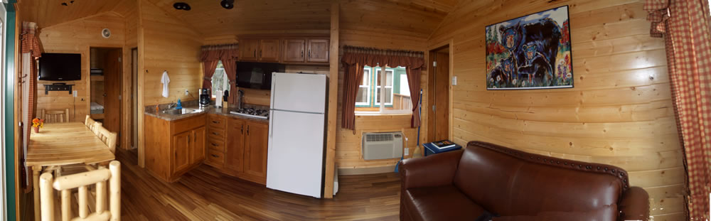 Deluxe Cabin L74 sleeps 6 guests. There is a bedroom with a queen sized bed on the right of the living area. To the left of the livingroom/kitchen area is a small room with a set of bunkbeds. In the livingroom area is a hide-a-bed. The kitchen area has a microwave, refrigerator, coffee pot and dishes for your convenience. The livingroom and main bedroom each have TV sets. There is a DVD player in the livingroom.
